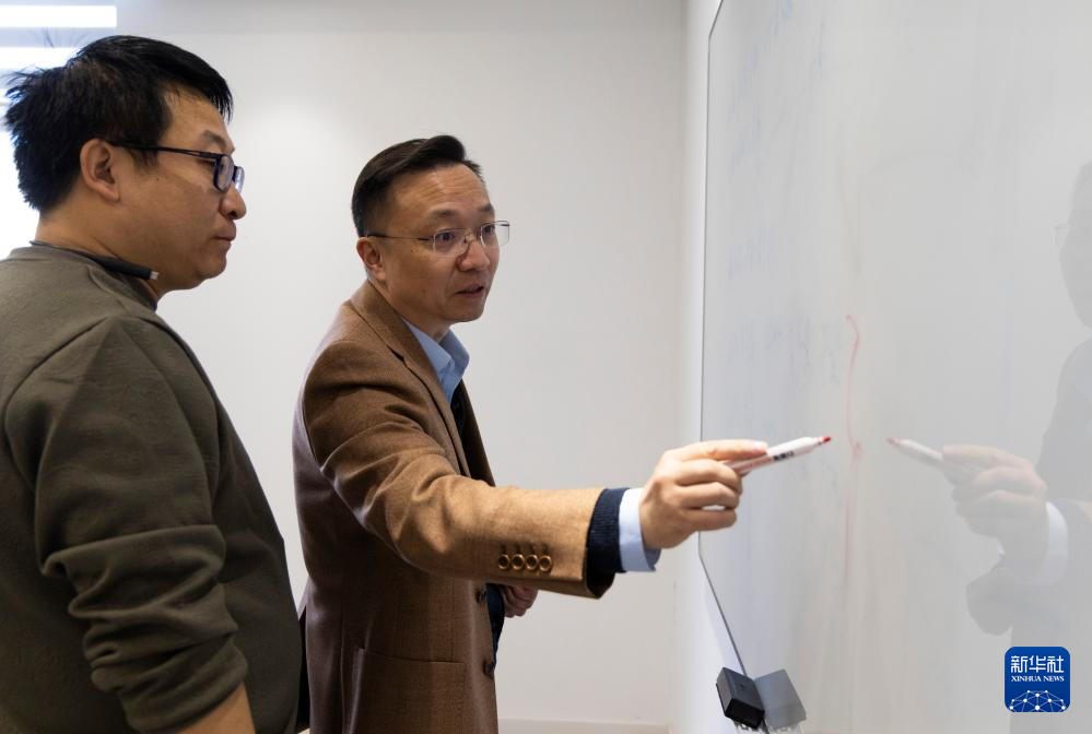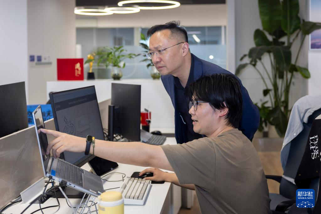 2024年10月24日,曾伟刚(右)在位于西安的办公室与研发部门同事讨论工作进展。