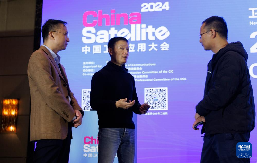 在2024年10月25日于北京举行的2024中国卫星应用大会上,中科天塔发布航天私域大模型“华山”,曾伟刚(左)和首席技术官董卫华向感兴趣的听众介绍情况。
