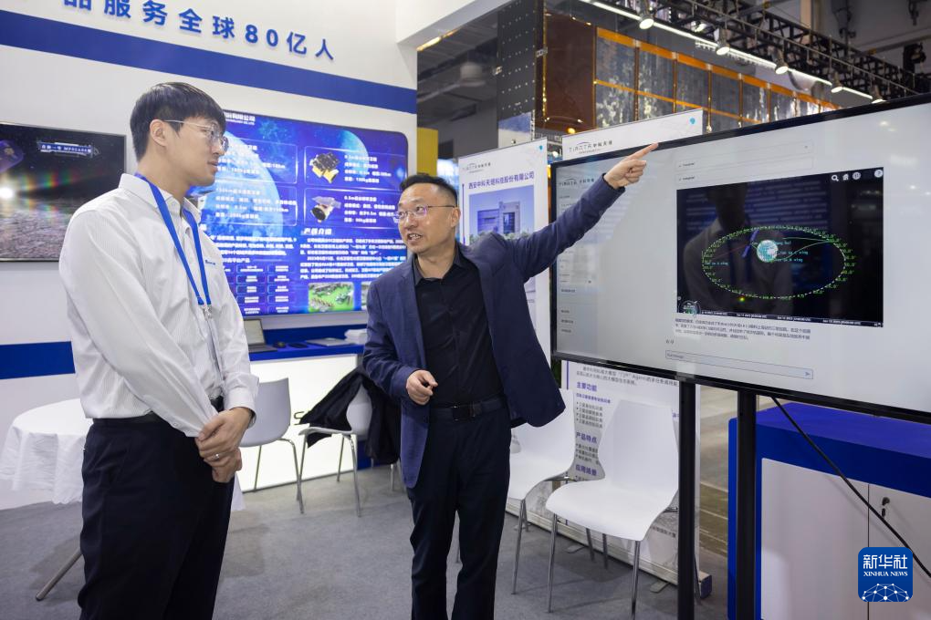 2025年4月24日,在上海举行的2025年“中国航天日”活动路演区,曾伟刚(右)为合作单位代表介绍升级迭代的航天私域大模型“华山”。
