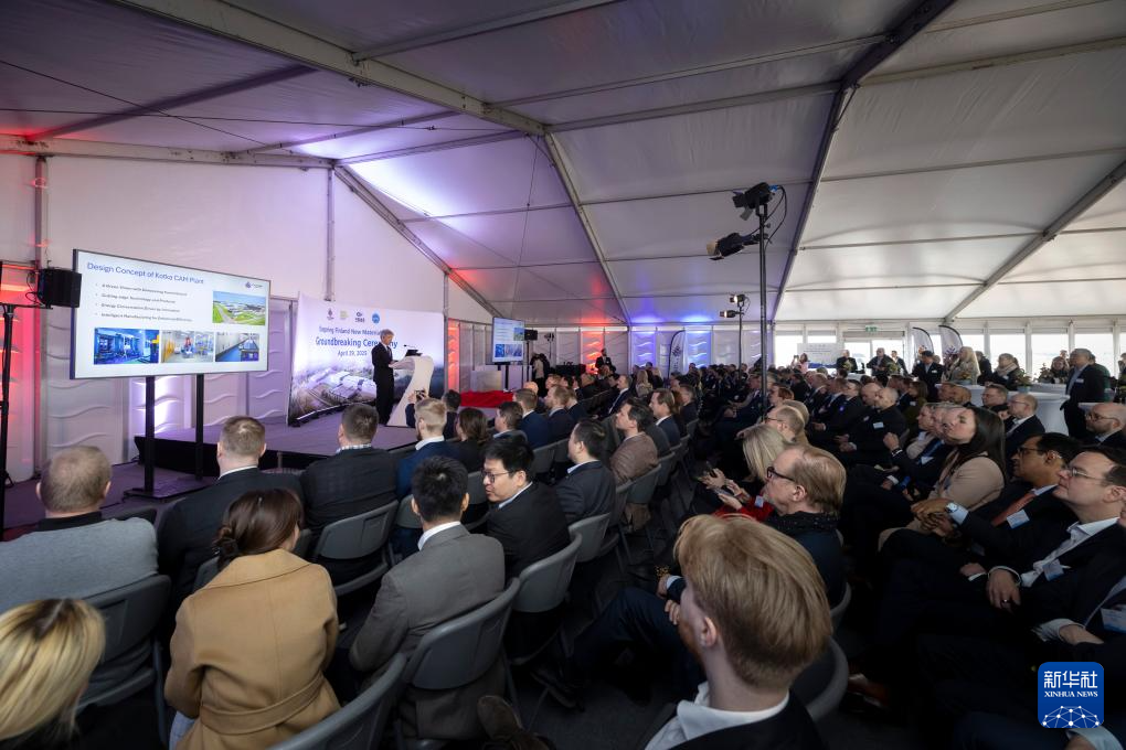 这是4月29日在芬兰东南部城市科特卡拍摄的中芬合资、芬兰首家锂电池材料工厂开工仪式现场。