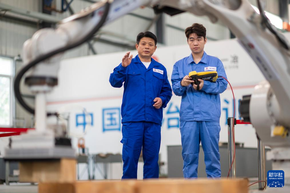 4月25日,吴春桥(右)与工作室成员测试焦炉炉头砌筑机器人。