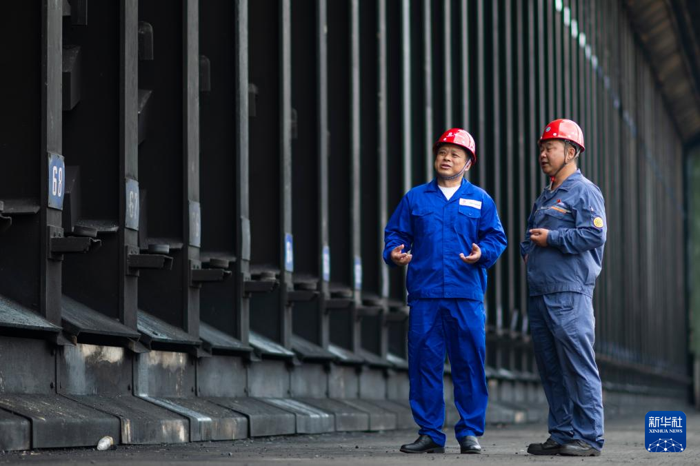 4月27日,在吴春桥参建过的武钢一座焦炉炉顶,吴春桥(左)与宝武集团武钢有限焦化公司机械技能大师龚九宏查看焦炉炉顶上升管工作状态。