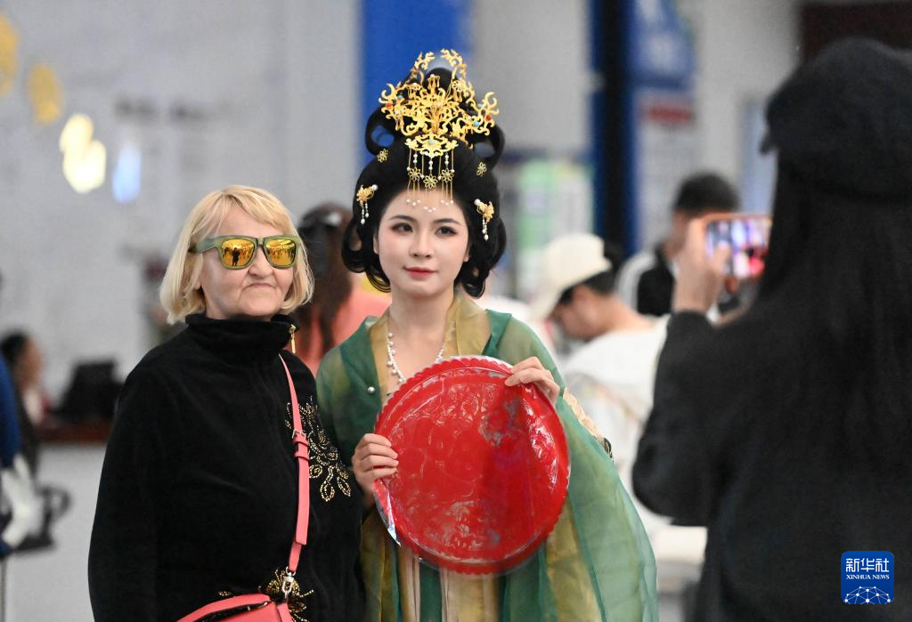 5月1日,一名外籍游客在天津国际邮轮母港客运大厅与演出人员合影。