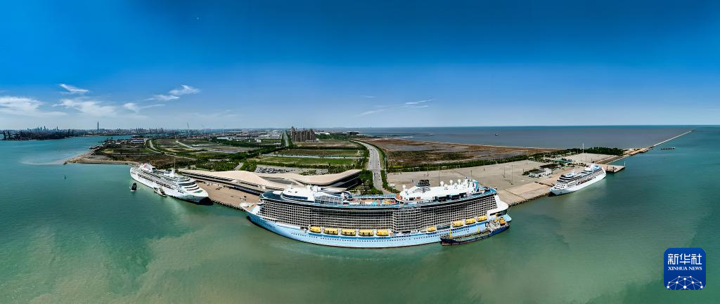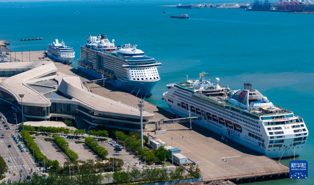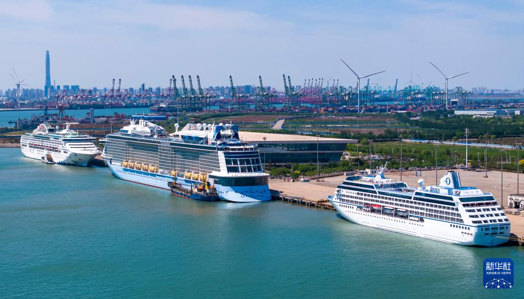 5月1日,三艘国际邮轮停靠在天津国际邮轮母港(无人机照片)。