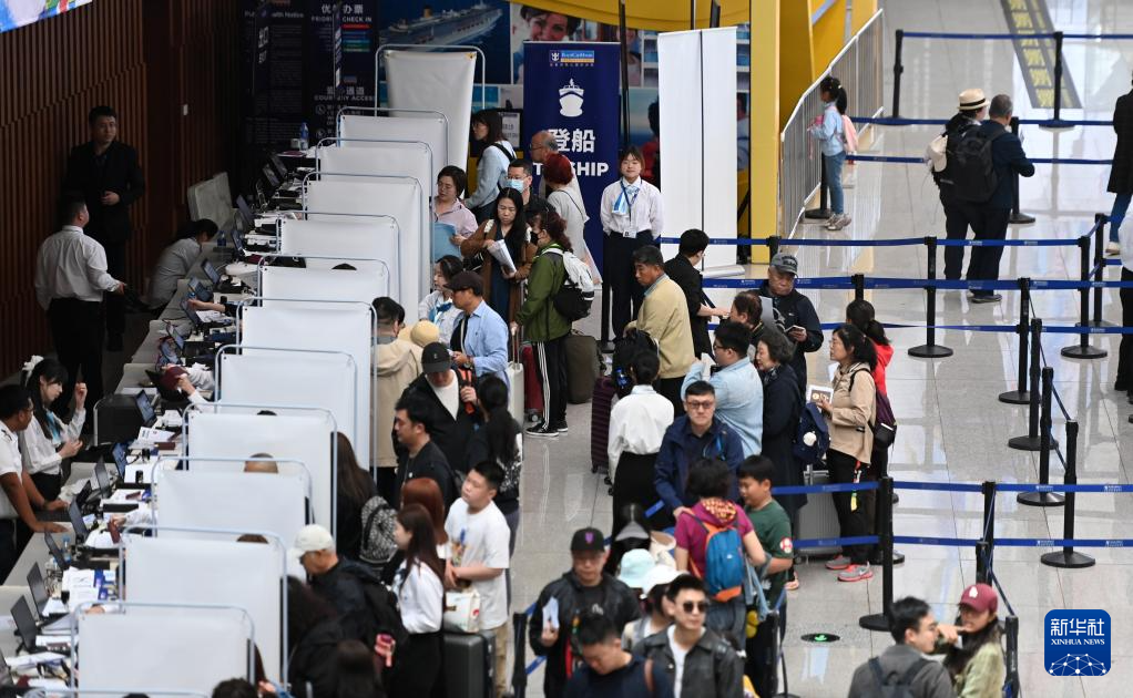 5月1日,游客在天津国际邮轮母港客运大厅办理登船手续。