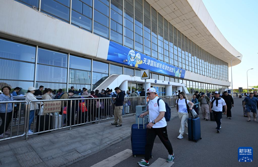 5月1日,游客排队进入天津国际邮轮母港客运大厅。