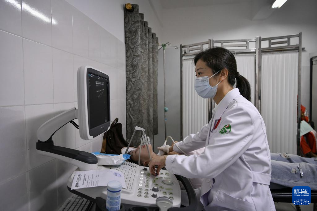 4月29日,在位于几内亚首都科纳克里的中几友好医院,中国医疗队医生赵晶为患者做超声检查。