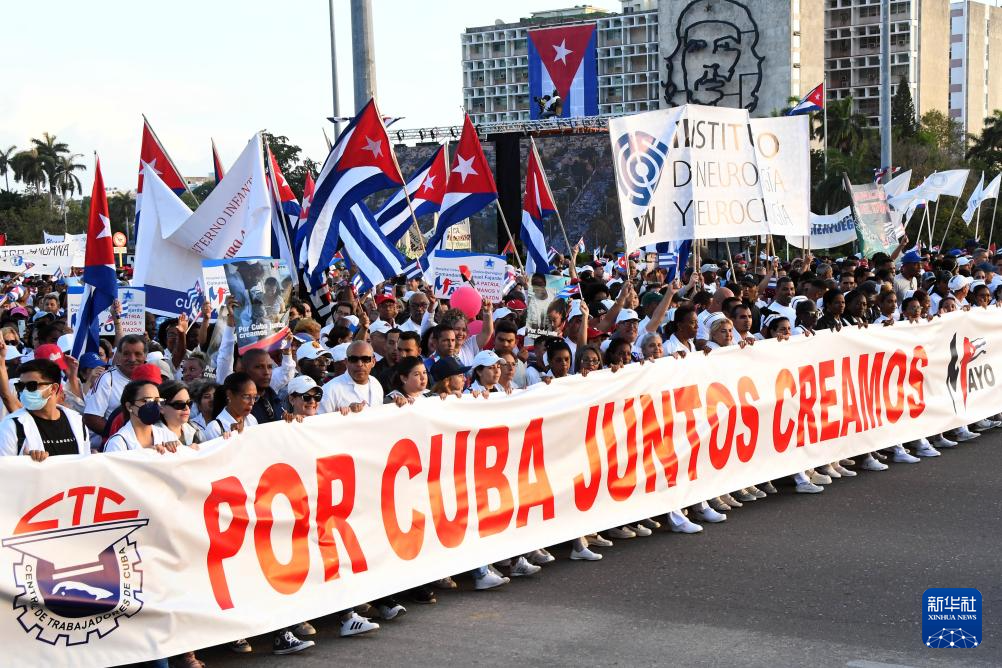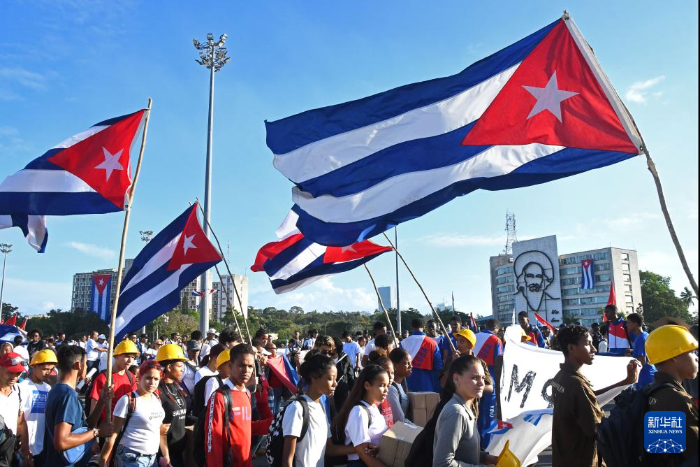 5月1日,在古巴首都哈瓦那革命广场,人们手持国旗和横幅参加“五一”国际劳动节集会游行。