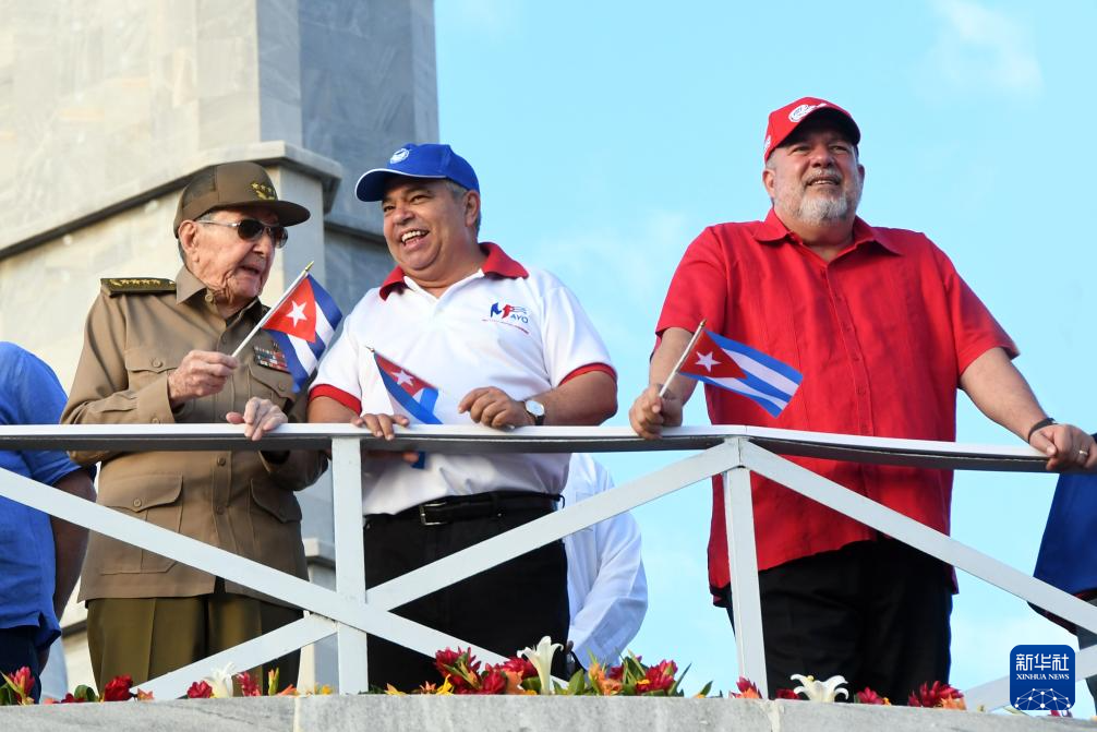 5月1日,在古巴首都哈瓦那革命广场,古巴革命领袖劳尔·卡斯特罗(左)、古巴工人中央工会总书记乌利塞斯·吉拉特(中)、古巴总理马雷罗(右)出席活动。
