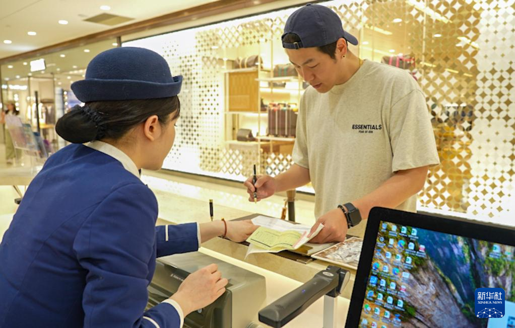 4月11日,在位于重庆市江北区的星光68购物广场,工作人员(左)为一名韩国游客办理离境退税“即买即退”业务。“即买即退”是指在已实施离境退税政策的地区,境外旅客在“即买即退”商店购买退税物品时,签订协议书并办理信用卡预授权后,即可在该商店现场申领与退税款等额的人民币款项。