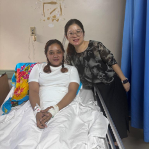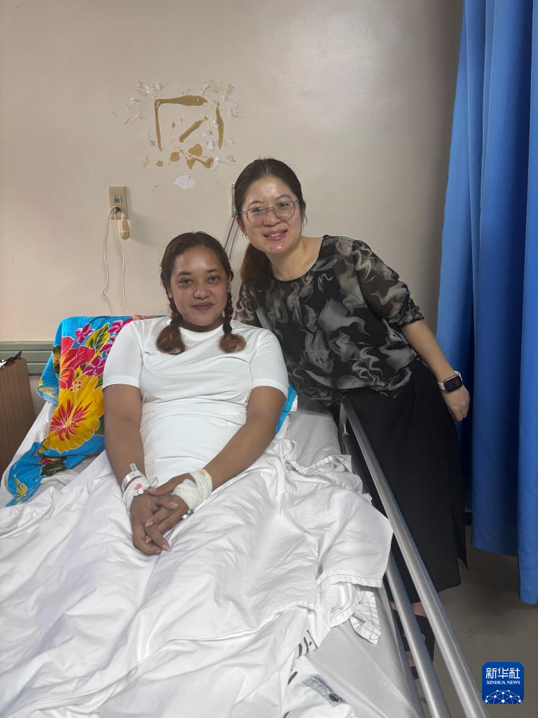 在汤加首都努库阿洛法,中国医疗队妇科专家张海凤(右)与患者萨劳特在维奥拉医院合影(2月27日摄)。