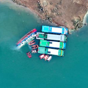 5月4日,救援人员在对倾覆船只进行搜救(无人机照片)。
