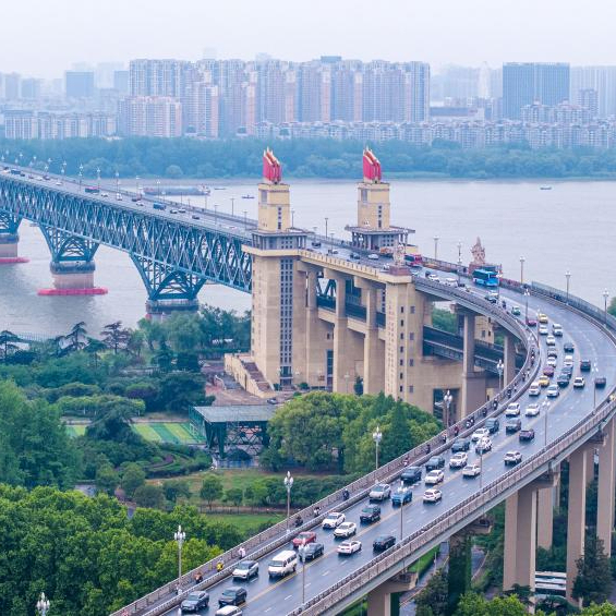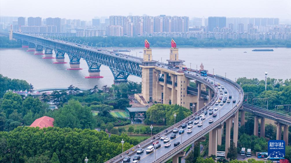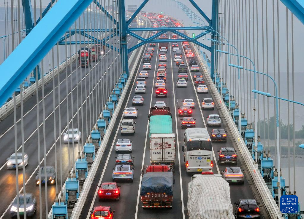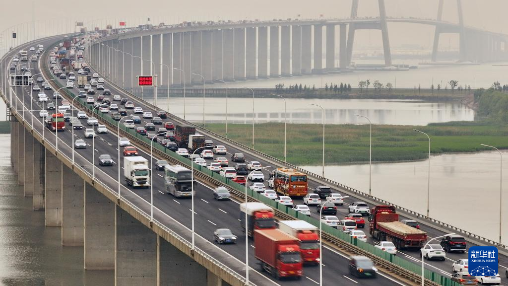 这是5月5日拍摄的南京长江大桥上的车流(无人机照片)。