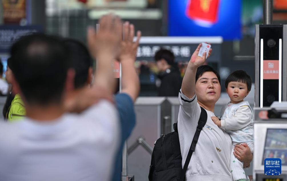 5月5日,在重庆火车北站,旅客与亲友挥手告别。