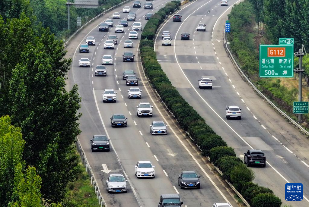 5月5日,在河北省遵化市境内拍摄的承唐高速公路上的车流(无人机照片)。