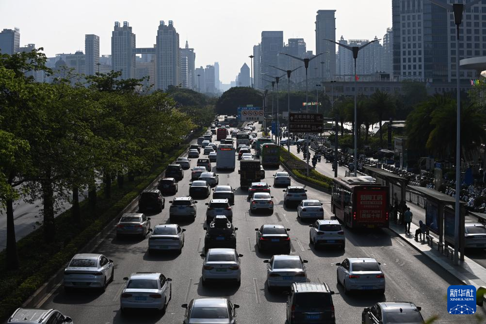 5月5日,进城车辆行驶在广西南宁市民族大道上。