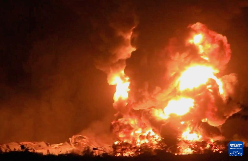 5月5日,在也门荷台达省东部巴吉勒区,一家水泥厂遭到空袭后燃起大火(视频截图)。