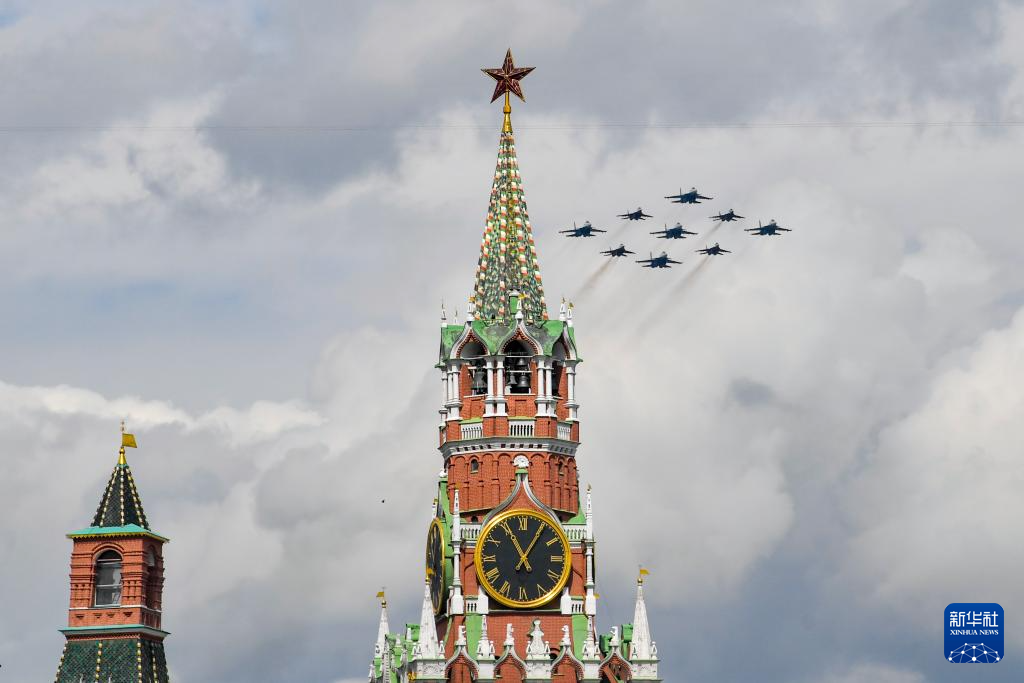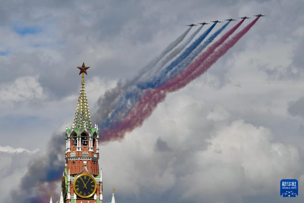 5月7日,在俄罗斯首都莫斯科,战机编队参加纪念苏联伟大卫国战争胜利80周年阅兵式彩排。