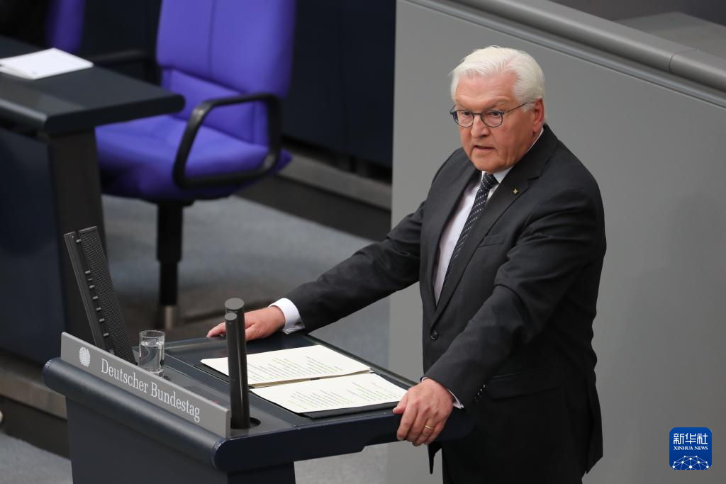 5月8日,德国总统施泰因迈尔在首都柏林国会大厦举行的纪念活动上致辞。