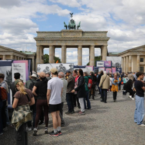 5月8日,人们在德国首都柏林的勃兰登堡门前参加纪念活动。
