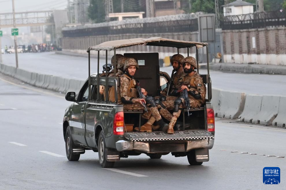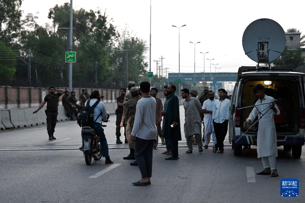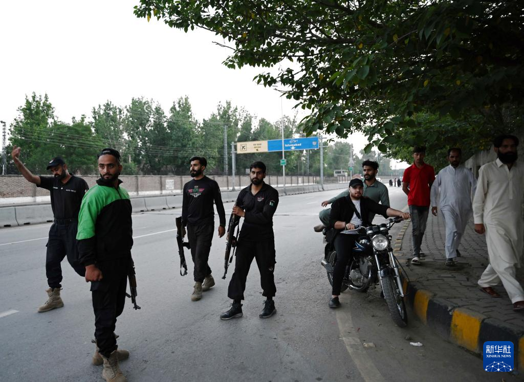 5月10日,在巴基斯坦拉瓦尔品第,安全人员在印度导弹袭击过后把守在通往努尔·汗空军基地的道路上。