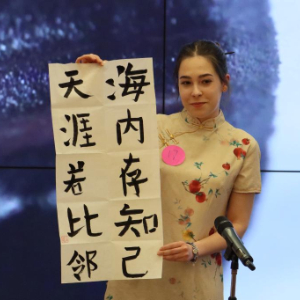5月10日,在罗马尼亚克卢日-纳波卡,选手在第24届“汉语桥”世界大学生中文比赛罗马尼亚赛区决赛上展示书法作品。