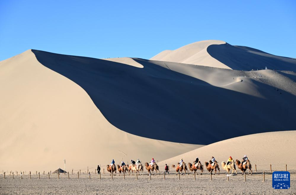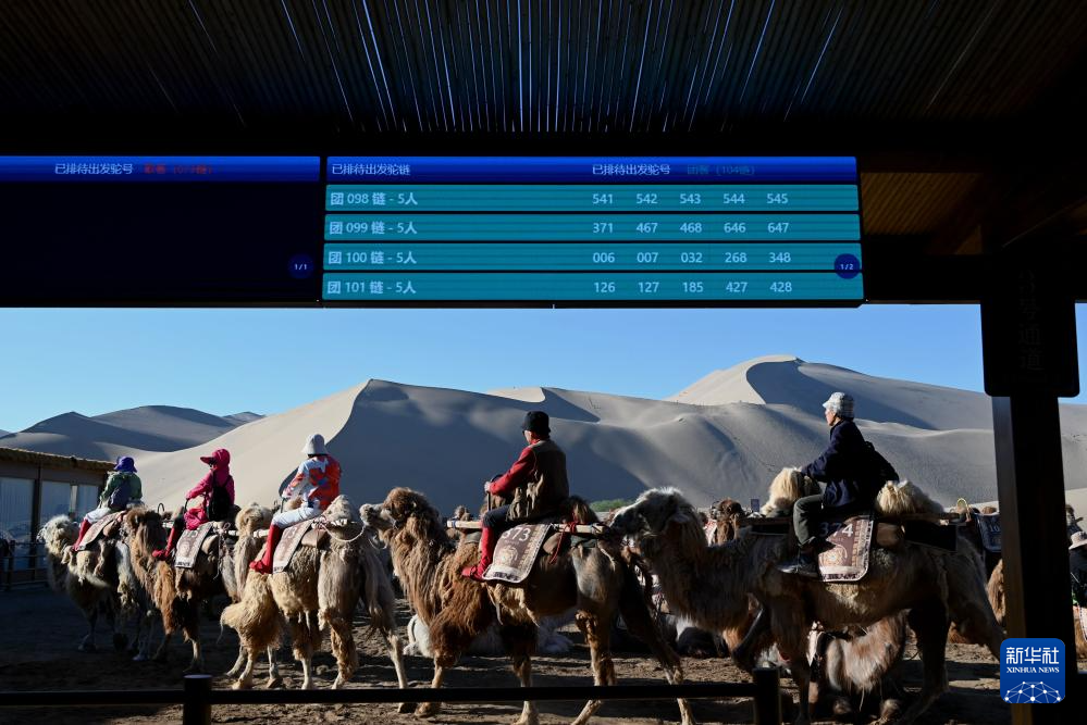 5月10日,在甘肃省敦煌市鸣沙山月牙泉景区骆驼乘骑区,游客有序乘骑骆驼。