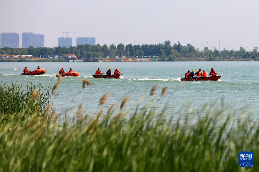 5月11日,救援人员在安徽省淮北市绿金湖参加水上救援演练。