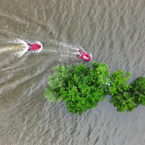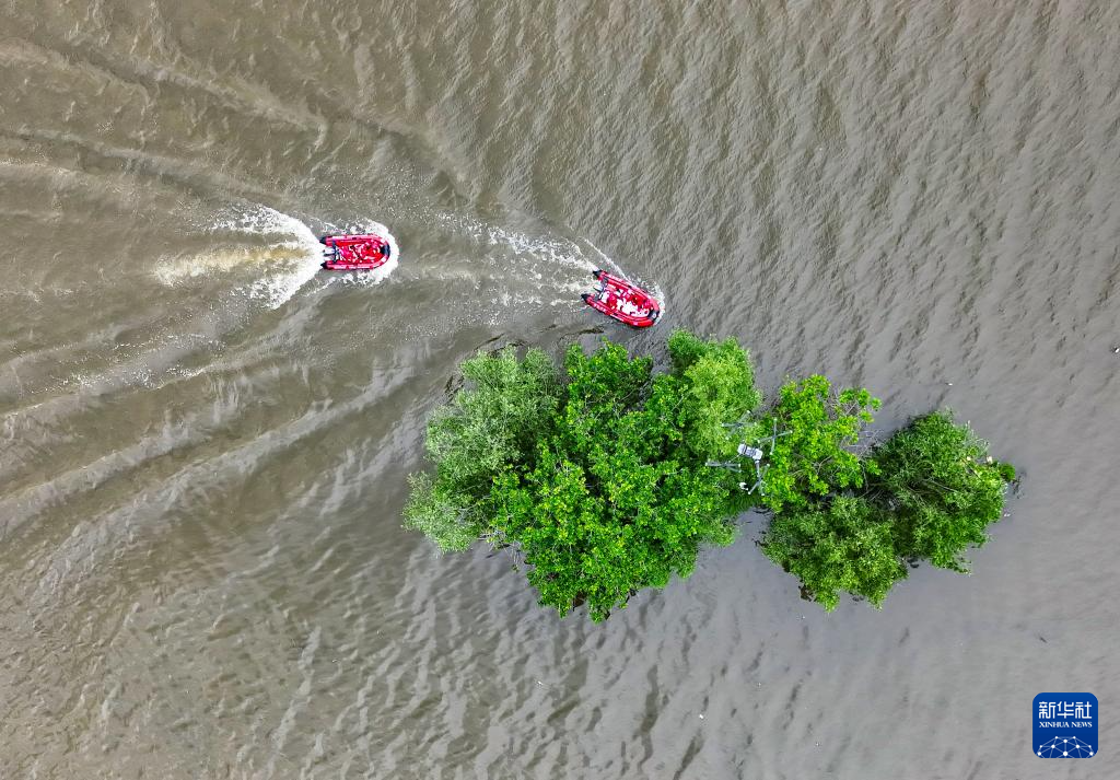 5月9日,浙江省金华市金东区应急管理局举行防灾减灾救灾综合应急演练,民间救援队在演练中驾驶快艇救助被困江中孤岛人员(无人机照片)。
