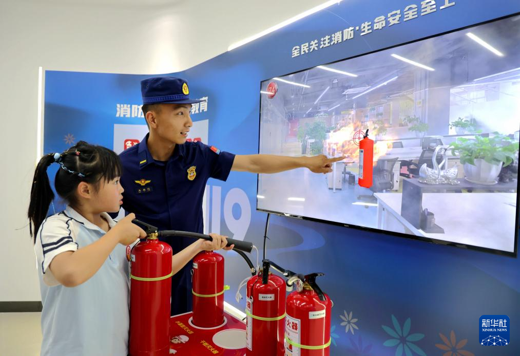 5月11日,在山东省滨州市阳信县劳店镇科普教育大厅,小朋友在消防救援队员的指导下进行模拟灭火训练。