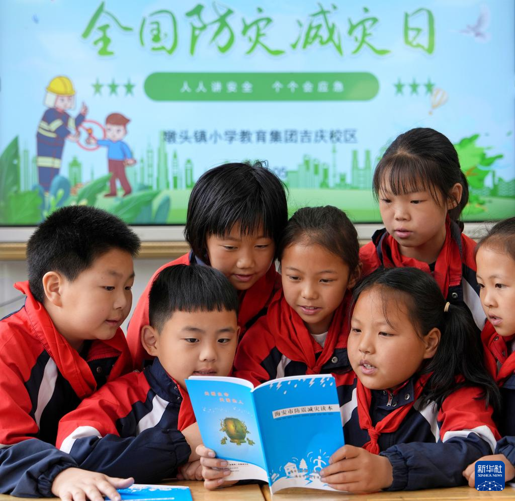 5月9日,江苏省海安市墩头镇小学教育集团吉庆校区的学生在阅读防震减灾读本。