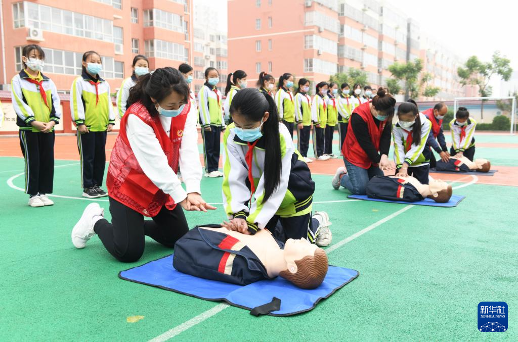5月11日,在河北省石家庄新乐市民生街小学,志愿者向学生讲解心肺复苏急救知识。