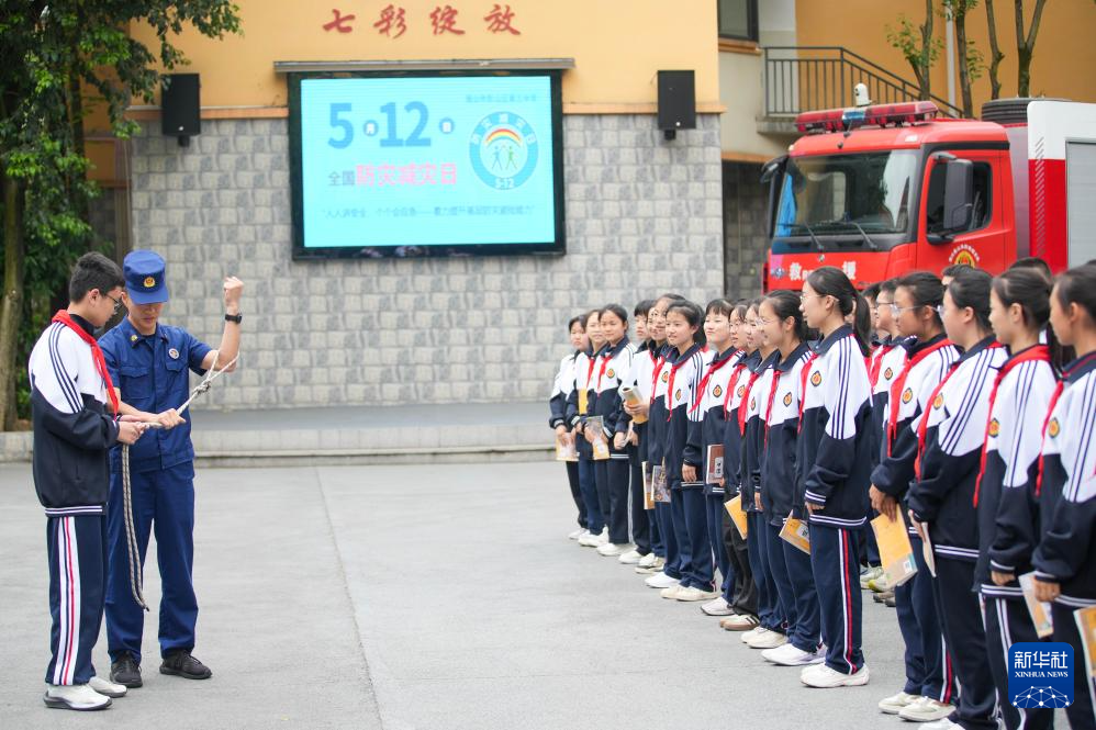 5月9日,消防救援人员给四川省眉山市彭山区第三中学的学生讲解安全绳知识。