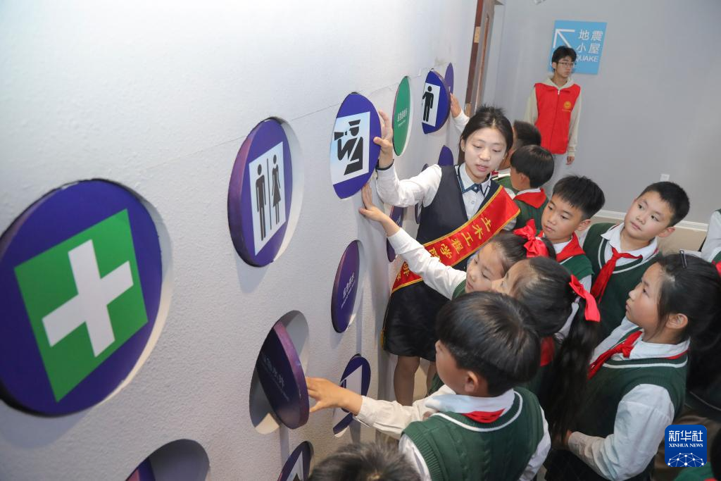 5月8日,江苏省徐州市潇湘路学校的学生在防震减灾教育科普基地学习避险标志。