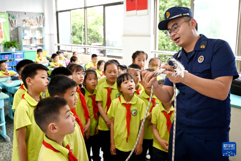 5月9日,浙江省武义县消防大队救援人员为武义县实验小学学生讲解逃生绳的使用方法。