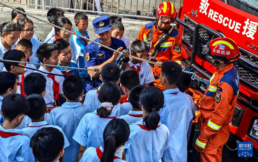 5月9日,在云南省普洱市景谷县森林消防中队,消防员向学生讲解滑轮在救援中的运用。