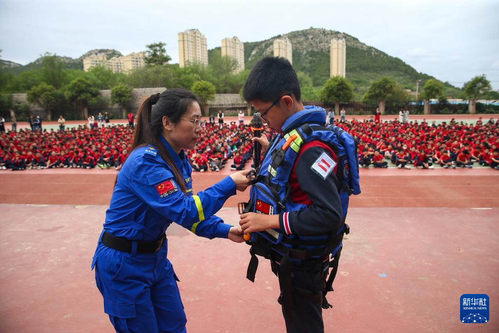 5月9日,在山东省济南市泉海小学,蓝天救援队志愿者给学生讲解、演示救援服穿法。