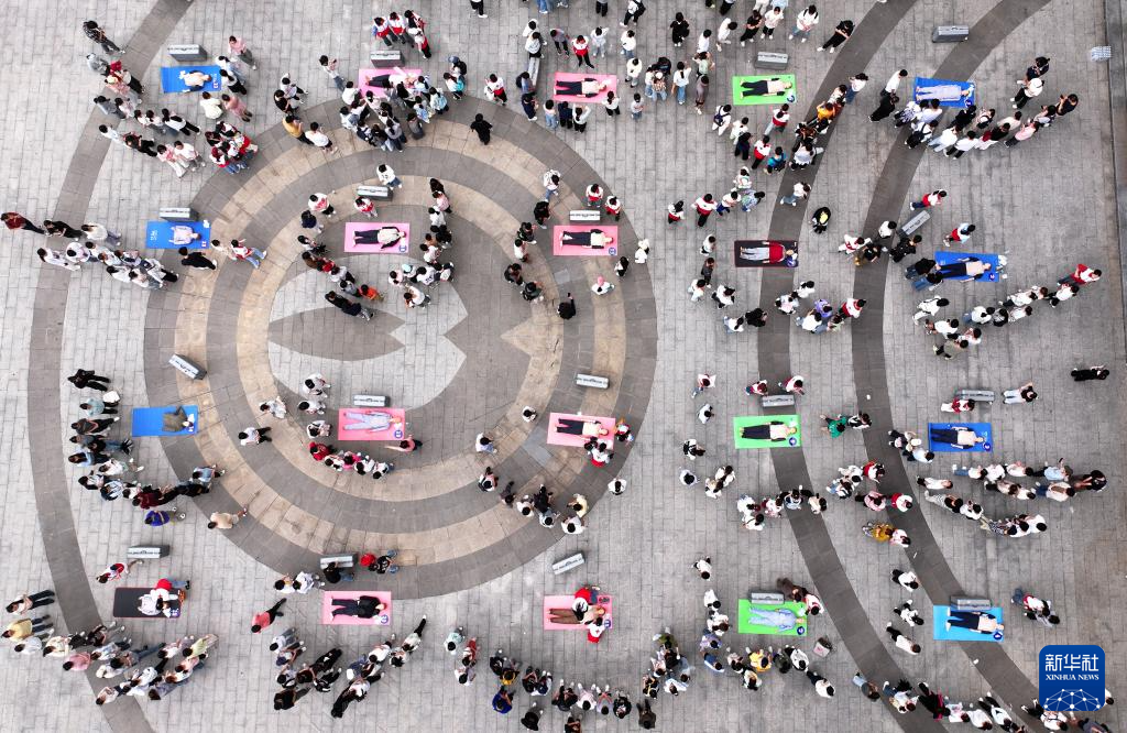 5月10日,在湖南省衡阳市,南华大学红十字会应急救护智能化培训基地的志愿者给学生们做心肺复苏急救的实操培训(无人机照片)。