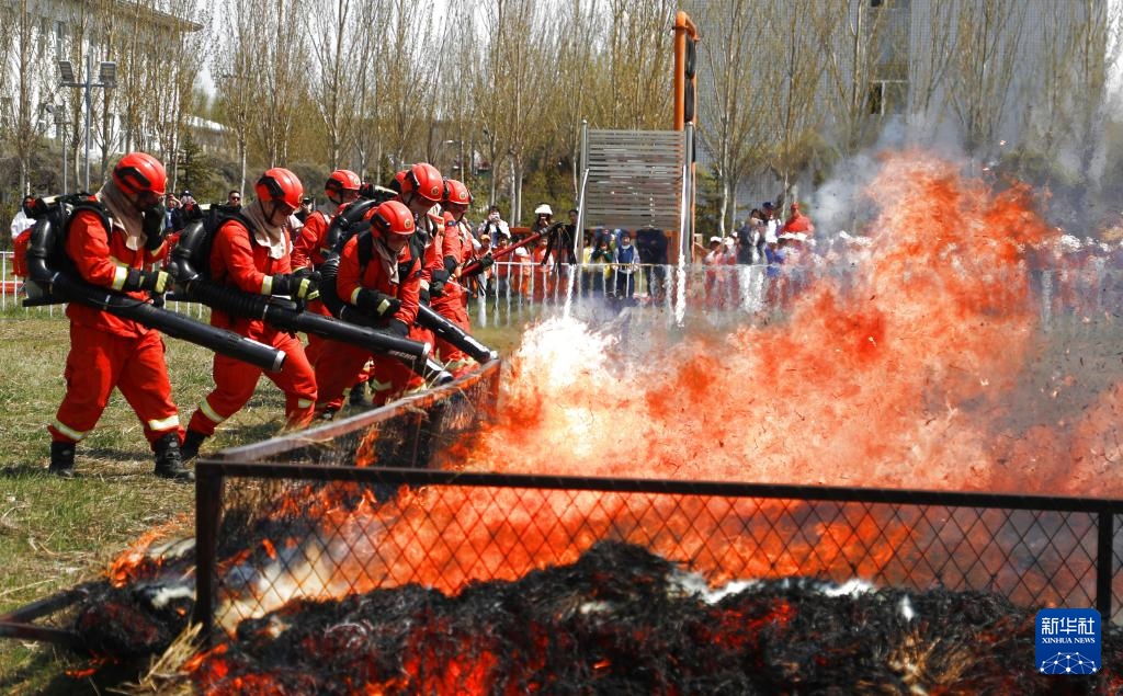 5月9日,在黑龙江省大庆市,国家消防救援局大庆航空救援支队的消防员向人们演示班组灭火作业。