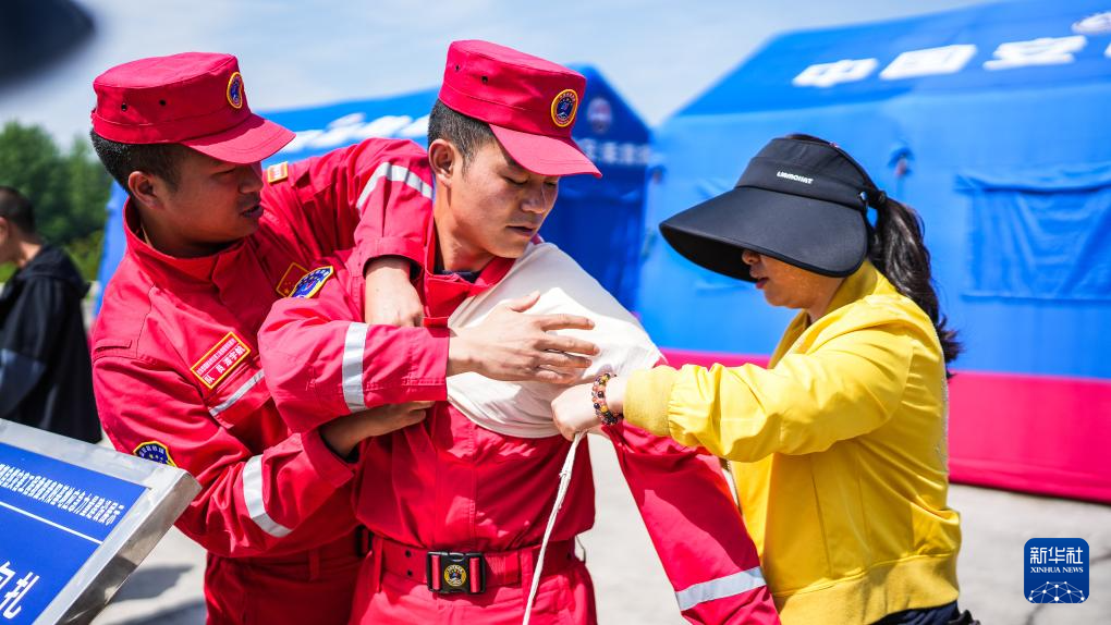 5月11日,在应急管理部自然灾害工程救援贵阳基地举行的防灾减灾开放日活动上,工作人员在向参观市民讲解如何进行快速包扎。