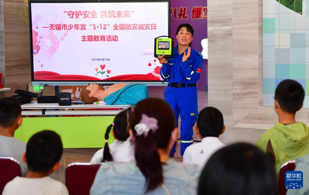 5月11日,在江苏省无锡市少年宫,无锡蓝天救援队队员为小朋友和家长讲解AED急救设备使用方法。