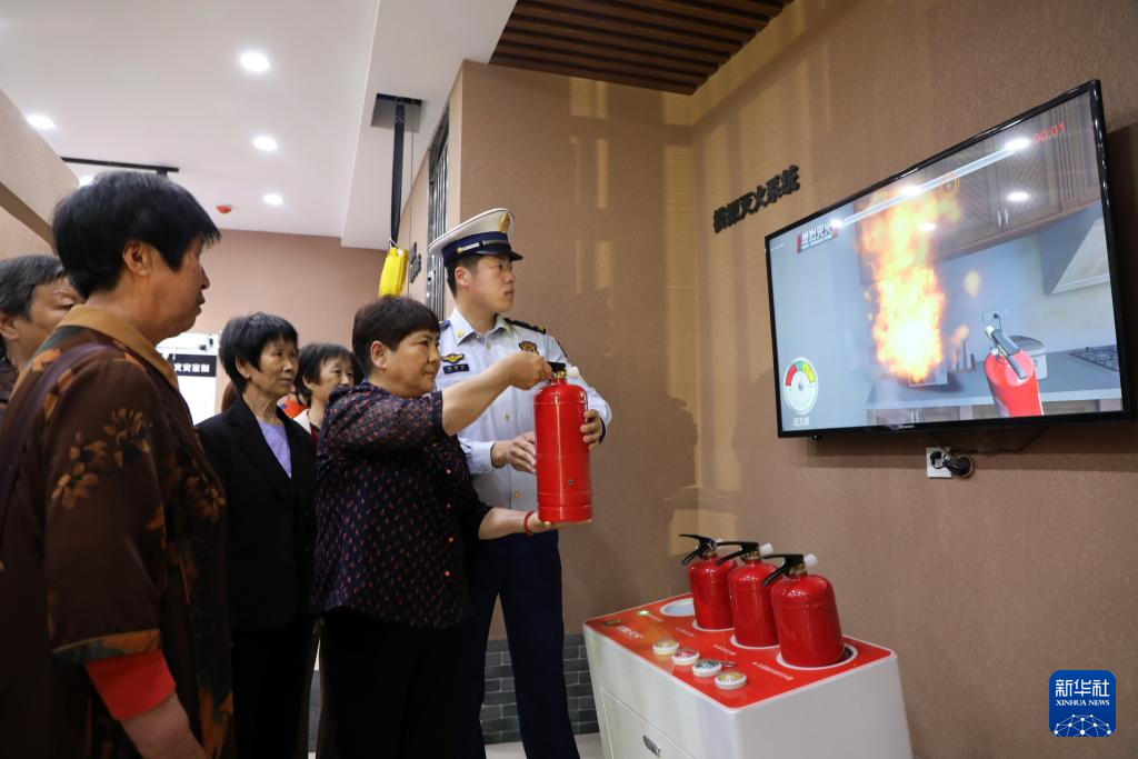 5月11日,在山东省滨州市博兴县,消防救援人员使用模拟灭火系统指导居民学习消防安全知识。