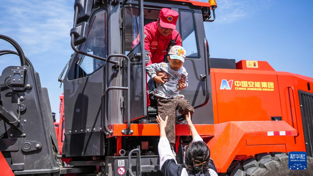 5月11日,在应急管理部自然灾害工程救援贵阳基地举行的防灾减灾开放日活动上,小朋友在工作人员的陪同下试乘特种工程车。