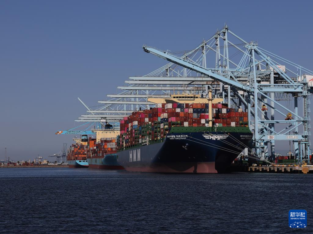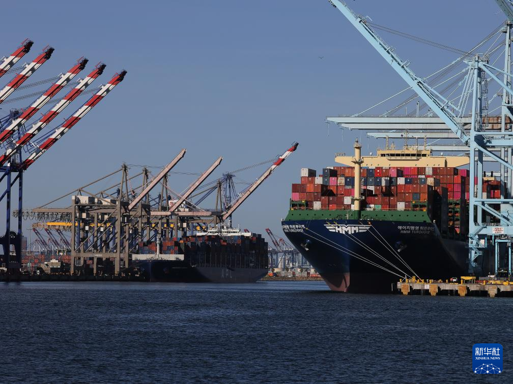 这是5月10日在美国洛杉矶港拍摄的货船。