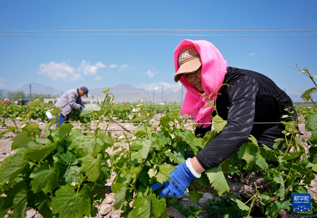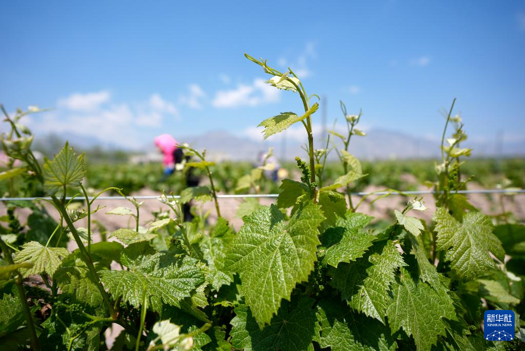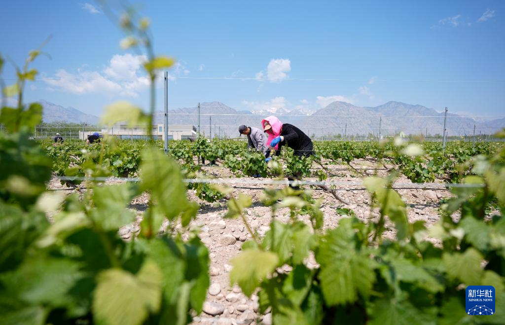 近日,宁夏贺兰山东麓种植的酿酒葡萄进入结果关键期,当地酒庄组织工人对葡萄藤进行抹芽、剪枝等管护工作,以保证葡萄长势。