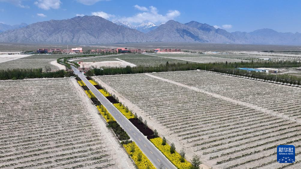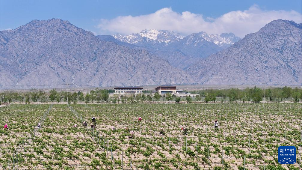 在位于宁夏银川市贺兰山东麓的海悦仁和酒庄,工人在为葡萄藤抹芽、剪枝(无人机照片,5月9日摄)。