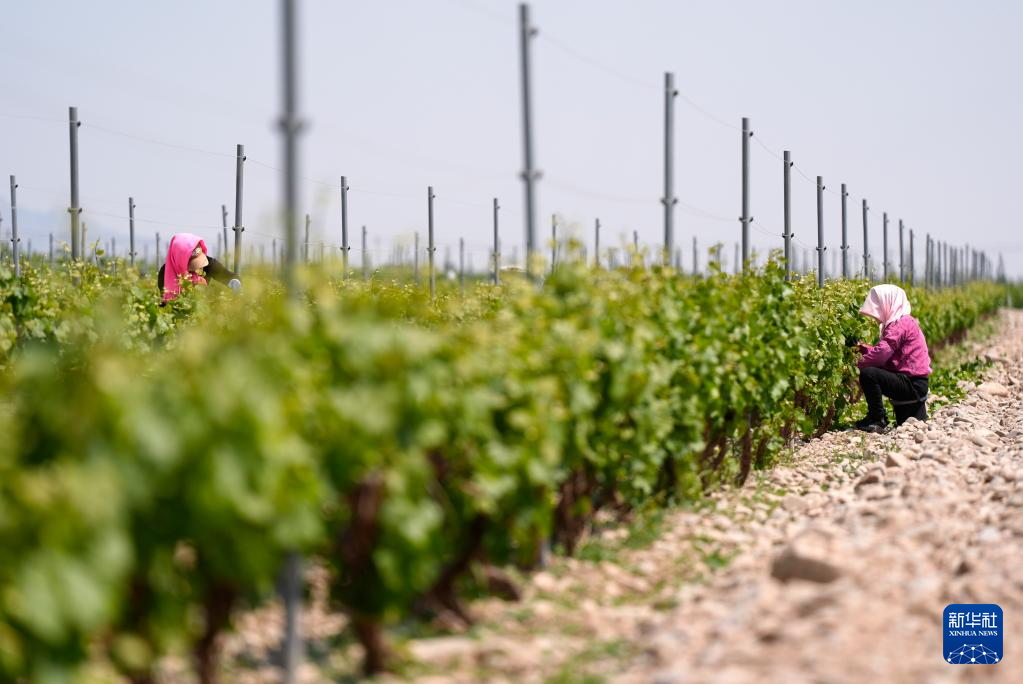 在位于宁夏银川市贺兰山东麓的海悦仁和酒庄,工人在为葡萄藤抹芽、剪枝(5月9日摄)。
