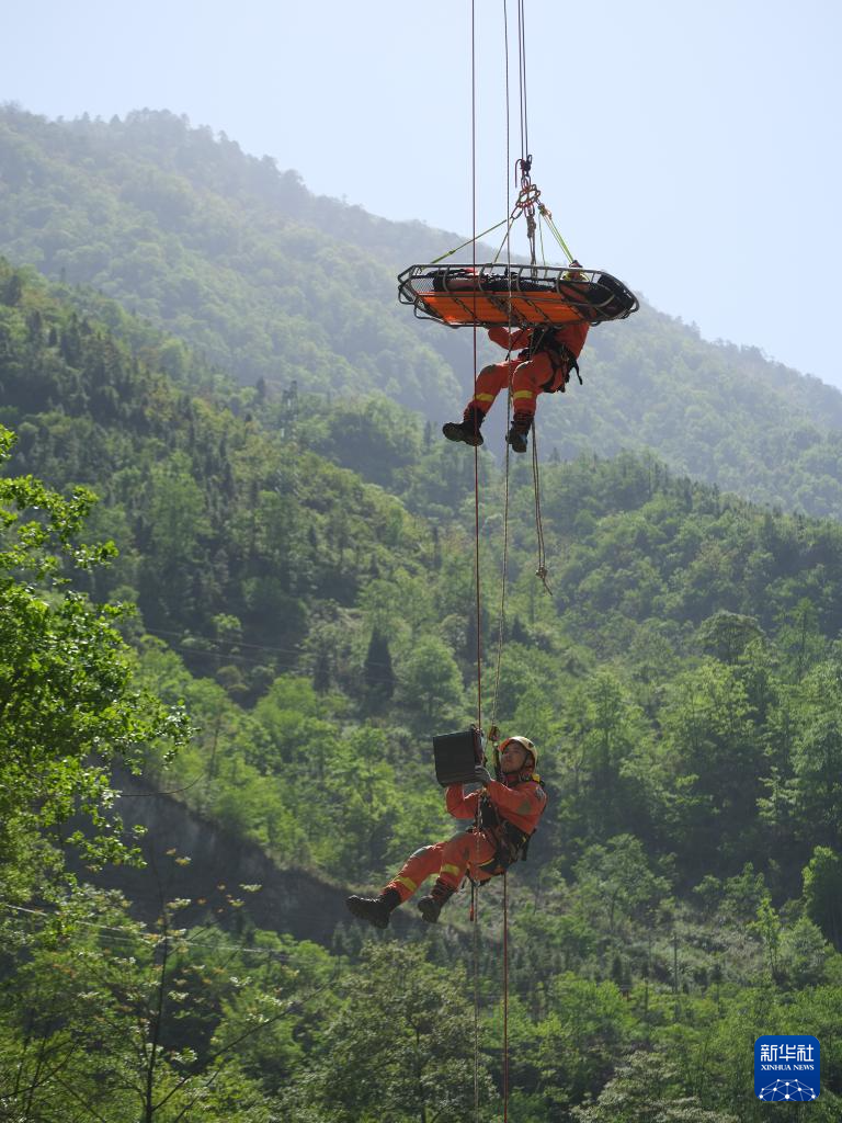 5月12日,在雅安市石棉县举行的四川省2025年抗震救灾演练中,四川省森林消防总队特勤大队消防员利用绳索系统高空转移“伤员”。