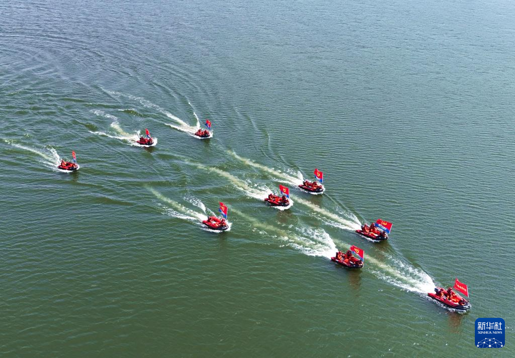 5月12日,在河南省南阳市开展的防汛抢险综合应急演练中,消防人员驾驶动力皮划艇进行水上救援演练(无人机照片)。