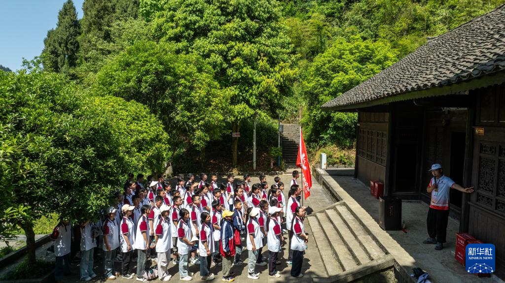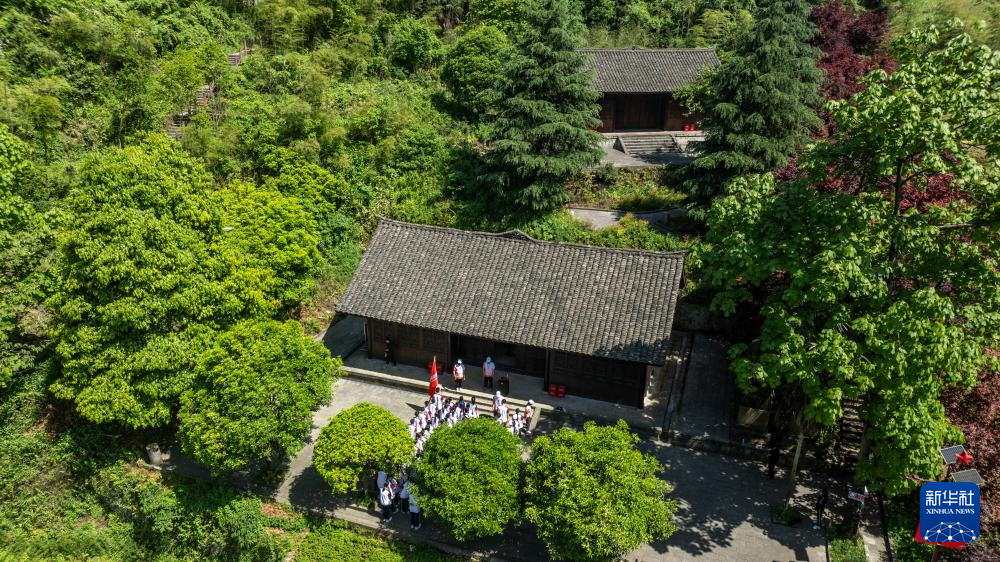 5月12日,威信县第一中学的学生在花房子会议会址参加红色研学活动(无人机照片)。
